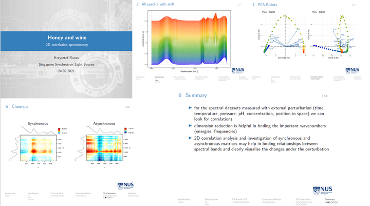 Internal Singapore Synchrotron Light Source seminar, season 1. Presenting the fundamentals of 2D correlation spectroscopy for time trials of liquid samples measured in open environment (air drying)